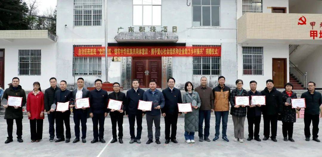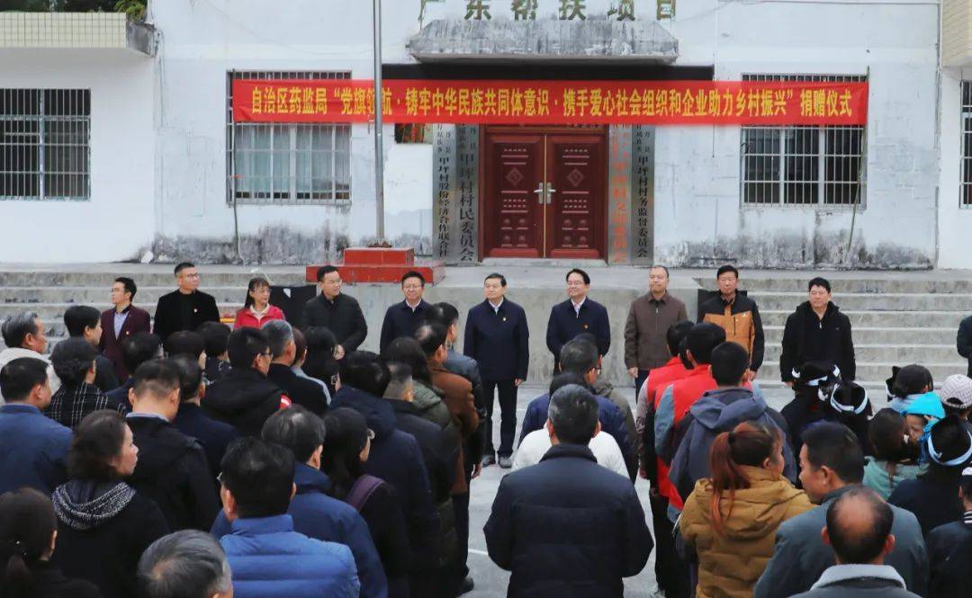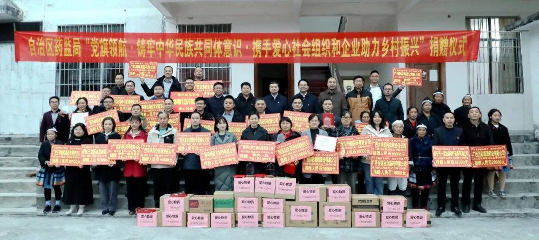 (中国)有限公司集团与广西医药商会、广西药师协会、广西医疗器械行业协会、广西化妆品协会等众多单位跟随广西壮族自治区药监局领导携手共赴南丹县,开展了以“党旗领航·铸牢中华民族共同体意识·携手爱心社会组织和企业助力乡村振兴”为主题的帮扶捐赠活动。