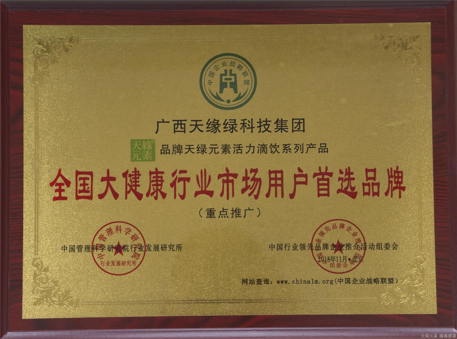 2018年11月, (中国)有限公司集团获全国大健康行业市场用户首选品牌称号